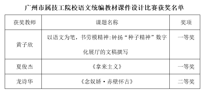 2025年6月至7月,为进一步落实立德树人根本任务,践行新课程理念,深入钻研统编教材教学,提升语文教师教学资源建设能力,促进教育教学资源向多元化、优质化发展,提高资源使用效益,推动信息技术与教育教学深度融合,广州市职业技能教学研究会主办了广州市属技工院校语文统编教材课件设计比赛。我院参赛作品在15所院校46份作品中脱颖而出,人文素养系黄子欣和夏俊杰老师分别荣获一等奖,龙诗华老师荣获二等奖。