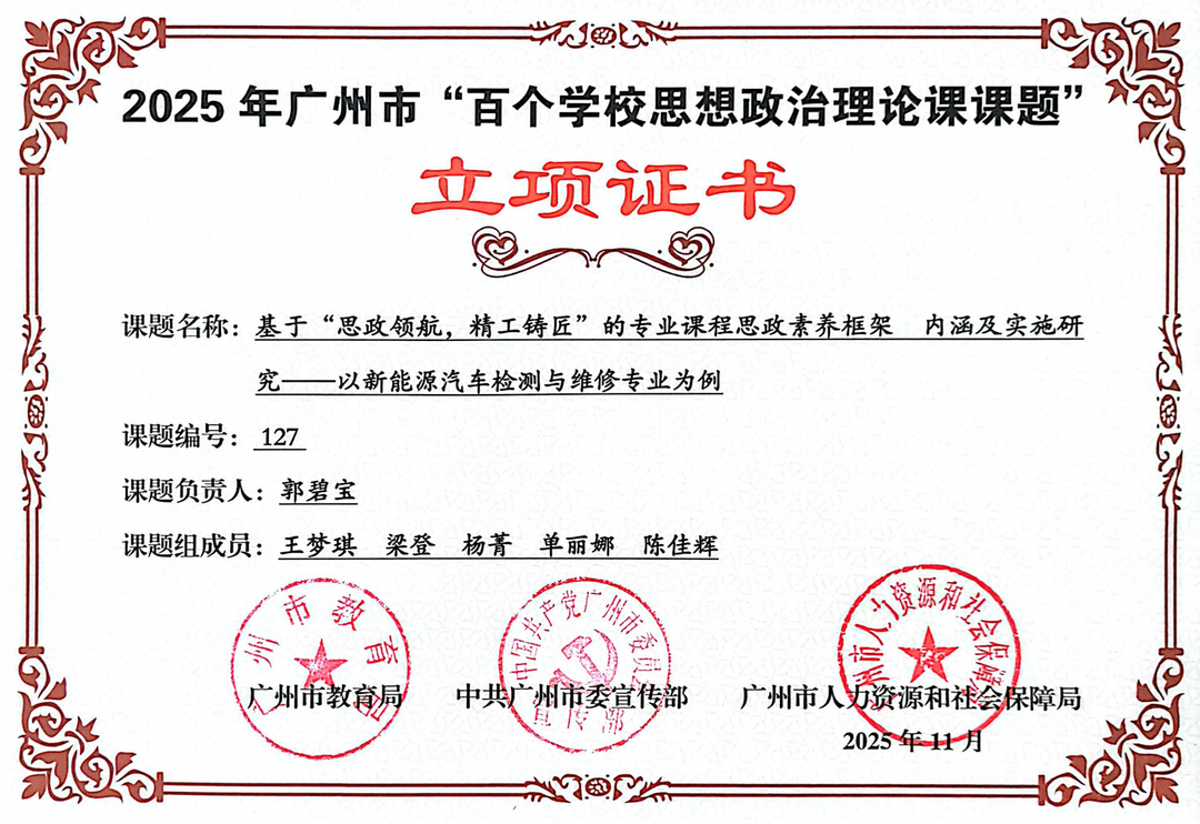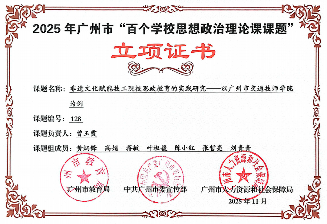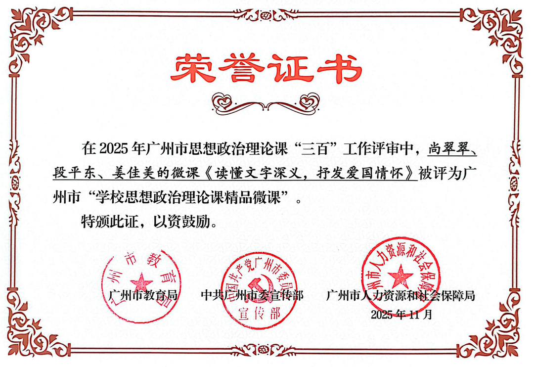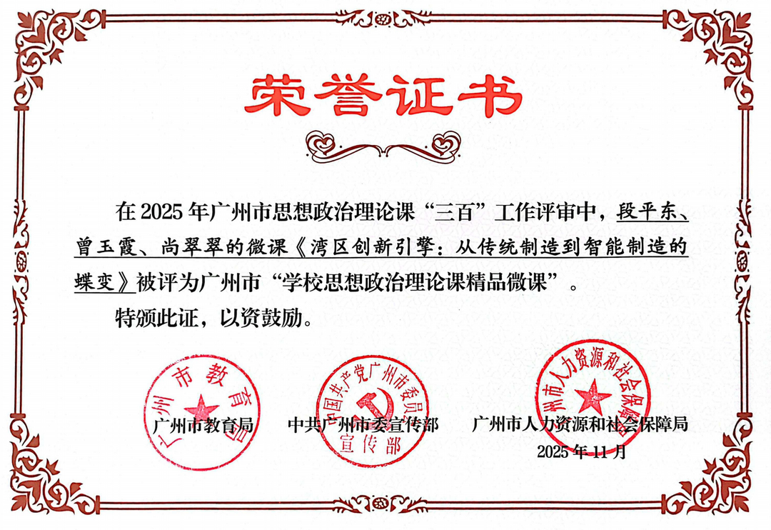 在广州市教育局、中共广州市委宣传部、广州市人力资源和社会保障局联合举办的第四届思想政治理论课“三百”工作评审中,广州市交通技师学院思政教师团队凭借扎实的专业功底、创新的教学实践与深厚的教研积淀,斩获多项荣誉。