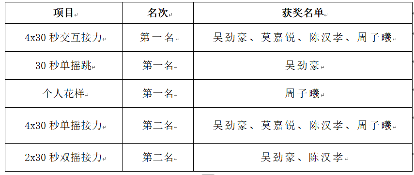 在速度类项目中,吴劲豪、莫嘉锐、陈汉孝、周子曦四位队员凭借默契配合与稳定发挥,在4×30秒交互接力项目中夺冠。个人赛中,吴劲豪在30秒单摇跳发挥稳定,展现出一贯的技术优势,获得第一名;个人花样环节,周子曦的花样动作编排技术难度高、动作连贯有创意,以高质量的完成度征服了评委,摘得桂冠。