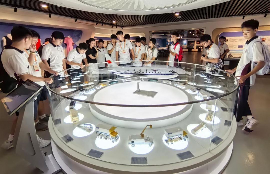 在航空发展历程区,从莱特兄弟展厅内的“机场地勤设备模型展区”成为实践学习的热门区域。提前做了功课的学生主动当起“小讲解员”,结合模型向同学们介绍机场服务飞机的各类车型,包括加油车、飞机牵引车、飞机客梯车等等。通过互动讲解与模型观察,学生们对机场地勤保障与飞机维修工作的联动关系形成了更直观、更深入地认知。“飞行者一号”到我国自主研发的ARJ21客机,讲解员以时间轴为脉络,系统生动讲述了航空工业的百年发展变迁。当驻足于“中国航空第一人”冯如的介绍展板前,学生们深刻领会到其既深耕设计又精研维修的工匠精神,进一步强化了作为飞机维修专业学生的职业认同感与责任意识。