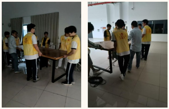 活动过程中,物流与商贸产业系副主任叶宇辉与一群身着黄色志愿者马甲的学子在室内搬运长桌的场景尤为动人。他们分工明确、动作协调,有的负责抬起桌角,有的负责指引方向,尽显团队协作之力,尽管汗水浸湿了他们的衣衫,但每个人的脸上都洋溢着快乐的笑容,因为他们知道自己的付出是有意义的。