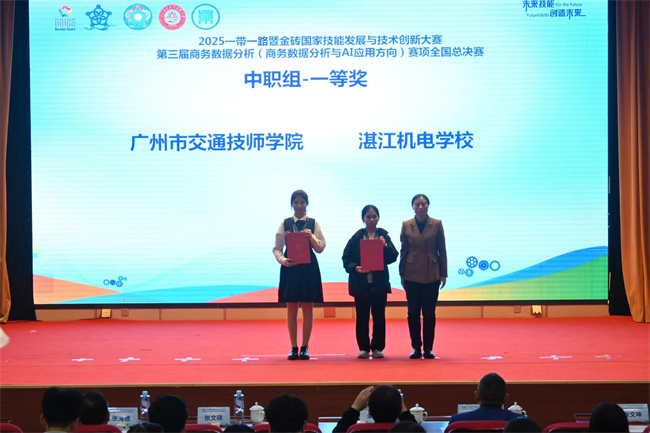 2025年10月26日,第三届“一带一路暨金砖国家技能发展与技术创新大赛”商务数据分析赛项(商务数据分析与AI应用方向)总决赛在山东济南顺利举行。由广州市交通技师学院学生欧阳镁滢、麦素媚、叶嘉玲组成的参赛团队表现优异,荣获中职组一等奖(第一名),学院同时获评“最佳组织奖”。