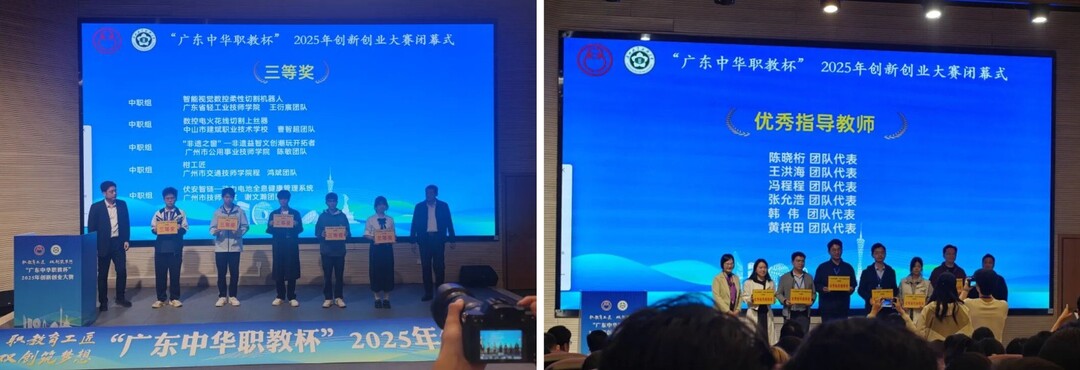 11月22日,由中共广东省委统战部、省教育厅、省人社厅指导,广东中华职业教育社主办的“广东中华职教杯”2025年创新创业大赛现场总决赛在广州圆满落幕。广州市交通技师学院师生凭借精准对接产业需求的高质量创新创业孵化项目,在决赛中表现优异,从全省70所院校的143个参赛项目中脱颖而出,共斩获中职组一等奖1项、三等奖1项,并荣获优秀指导教师团队奖,充分展现了学院在“以赛促教、以赛促创”方面取得的丰硕成果。