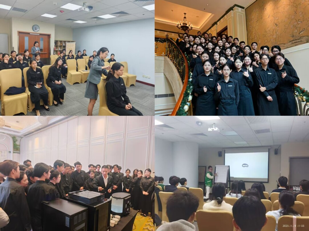 l 11月18日至19日,开展为期两天的集中培训,涵盖企业文化、仪容仪表、服务礼仪、水吧操作、应急处理等核心模块,由学院俞秋皓老师、酒店宴会部经理及资深培训师在酒店宴会厅亲自授课及示范讲解。