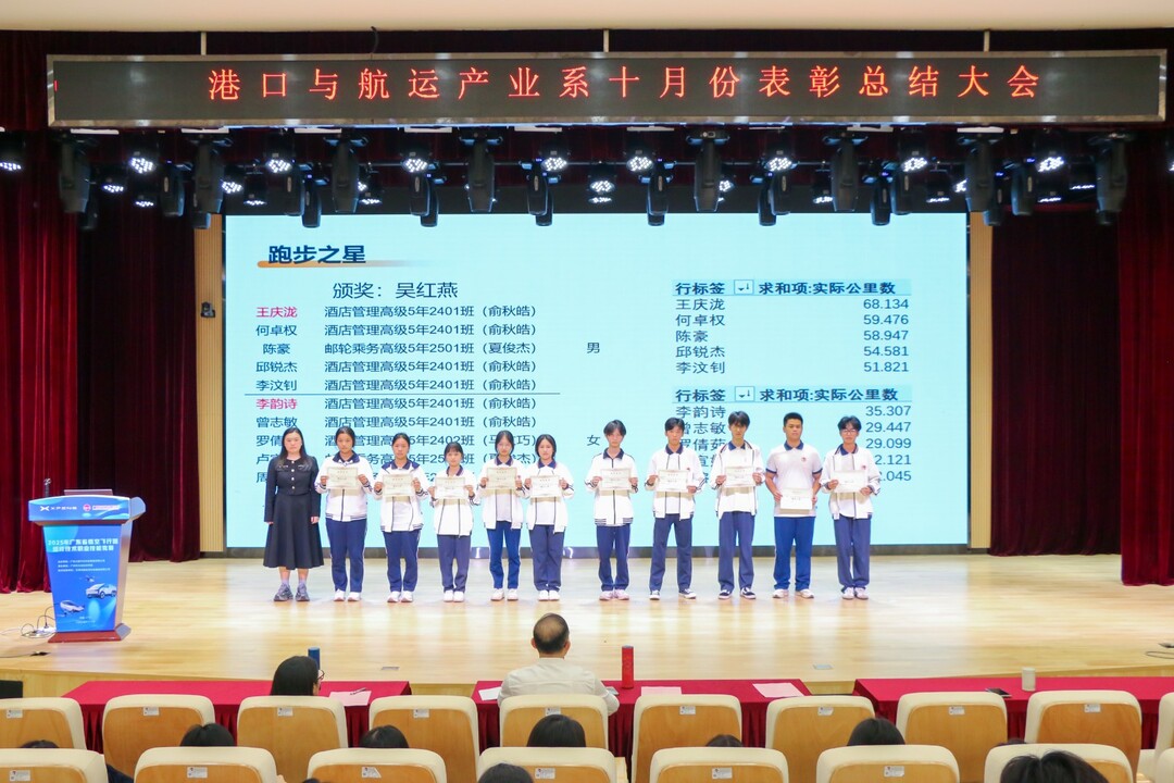 11月3日,广州市交通技师学院港航系十月份表彰总结大会在B2报告厅举行。学院专职纪委书记蒋碧涛、港航系主任曾志海、副主任张小利及系部师生代表齐聚,共证荣耀、凝聚力量。