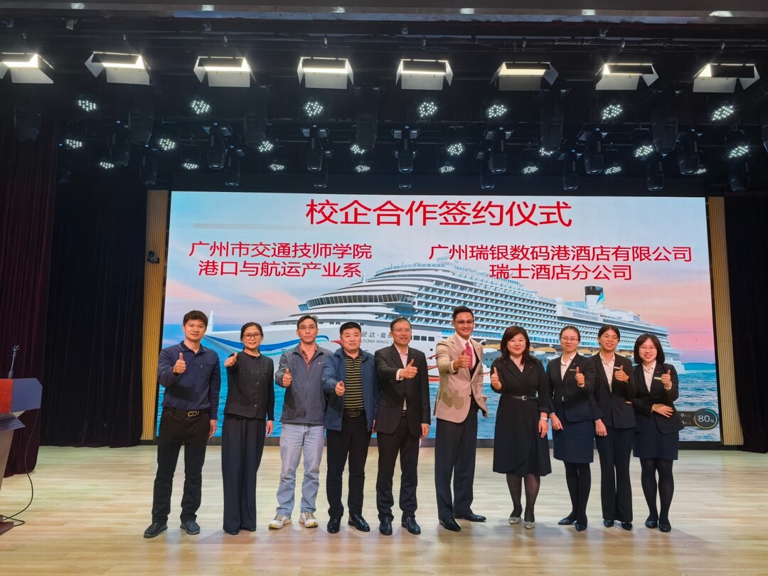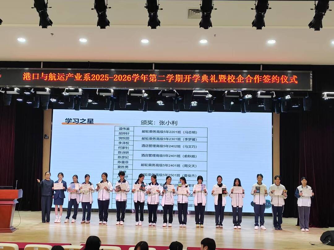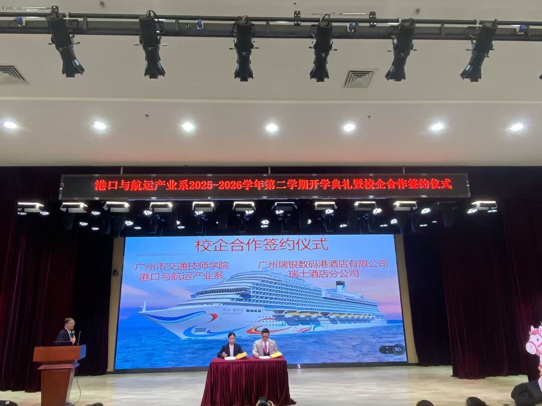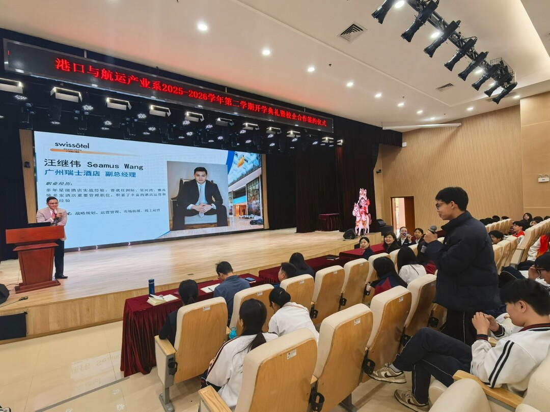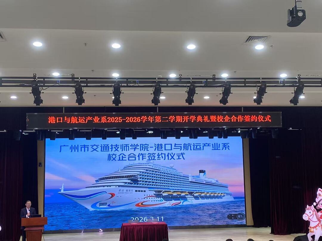 春启新程,笃行致远。2026年3月11日,广州市交通技师学院港口与航运产业系隆重举行2025-2026学年第二学期开学典礼暨校企合作签约大会。学校专职党委副书记伊晓浏、招生就业处副主任尹强飞、校企合作办公室主任李栋、港航系主任曾志海、副主任张小利及港航系全体教师出席本次大会。广州瑞士酒店副总经理汪继伟作为企业嘉宾受邀到场,港航系全体学子齐聚一堂,共同参与这场兼具成长指引与发展意义的盛会。
