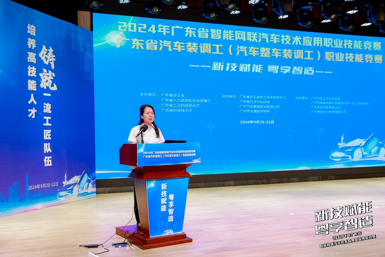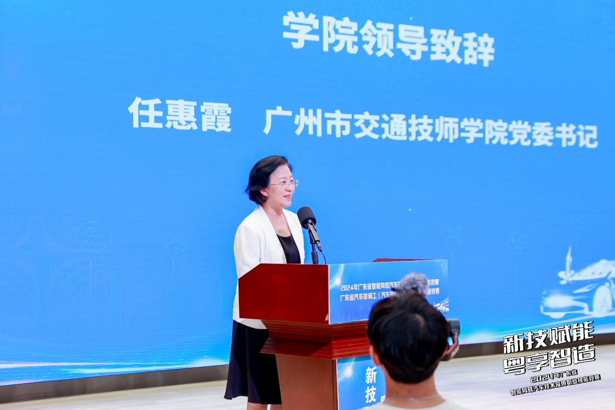 随着竞赛回顾视频的播放,一幕幕精彩瞬间再次呈现在大家面前,那些技艺的碰撞、智慧的火花,仿佛将时间定格在了最激动人心的瞬间。广州市交通技师学院任惠霞书记在致辞中,深情地回顾了赛事筹备与举办过程中,选手、工作人员及各方的辛勤付出与不懈努力。任惠霞书记指出,本次竞赛不仅是一次技能的比拼,更是行业技术发展的风向标,对促进智能网联与新能源汽车技术的创新与应用具有重要意义。