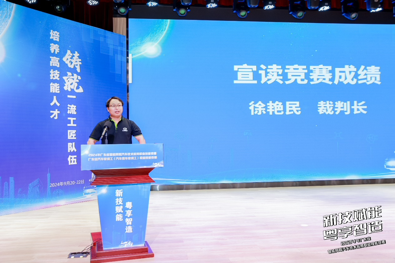 9月22日的竞赛闭幕式由广汽集团工会副主席祝春主持。广东省总工会一级巡视员张振飚、广东省总工会职工技术协作中心主任苏战合、广东省职业技能服务指导中心副科长黄伟白、广东省汽车行业协会秘书长郑钦、秘书长助理刘福尚、广州市总工会一级调研员(市管干部)邢立明、经劳部部长吴蕾、广州市职业能力建设指导中心副主任蔡小华、广汽集团工会主席邓蕾、培训中心主任王友标、人力资源部副部长温韵诗、广州市交通技师学院党委书记任惠霞、副院长刘海波,以及本次竞赛的命题专家:广东机电职业技术学院汽车学院副院长徐艳民、广汽埃安总师林小慰、番禺职业技术学院智慧汽车学院教授杨宪福及嘉宾等出席了闭幕式。此外,竞赛的裁判,选手和师生代表约300人参加了闭幕式。
