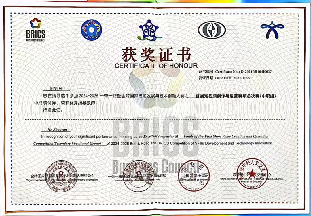 11月20日,由金砖国家工商理事会中方理事会、一带一路暨金砖国家技能发展国际联盟等单位共同主办的2025一带一路暨金砖国家技能发展与技术创新大赛——首届短视频创作与运营赛项国际总决赛在兰州职业技术学院(线上+线下)顺利举办。学院学生选手江晓盈、郭璐瑶、陈冠霖勇夺中职组一等奖;教师选手肖仕鑫荣获教师组二等奖;教师何钊雁荣获优秀指导教师奖;学院荣获中职组“最佳组织奖”、教师组“优秀组织奖”。