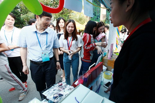 开幕式及协会成立仪式结束后,现场嘉宾跟随刘建卫副院长参观了本届交易会的摊位,了解学生的参展情况。刘副院长更是以顾客身份,亲自体验购买展品 。