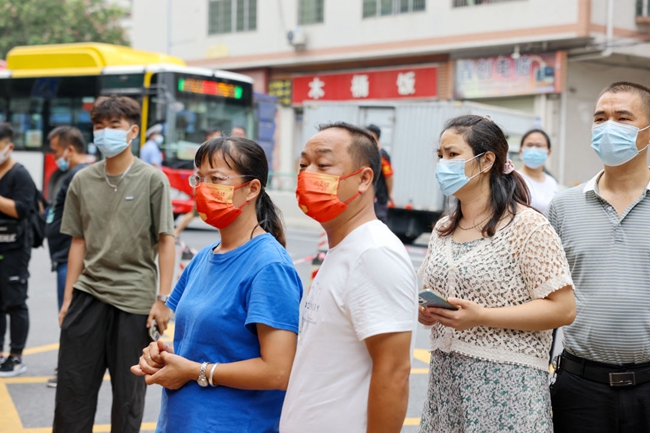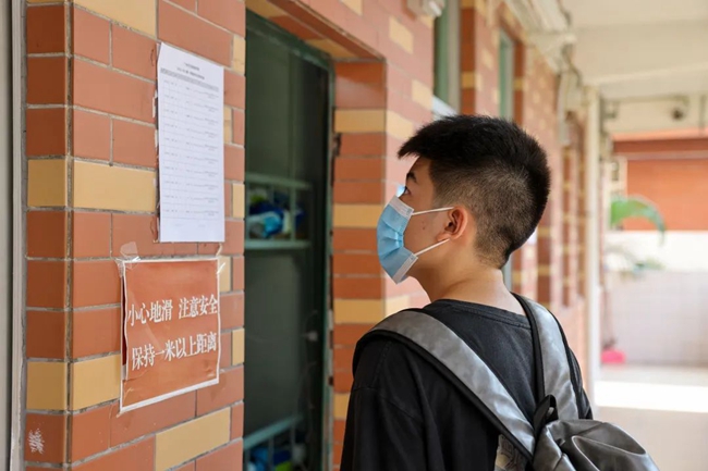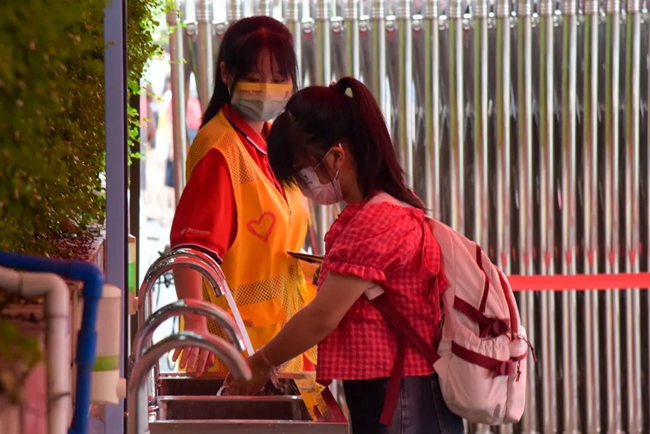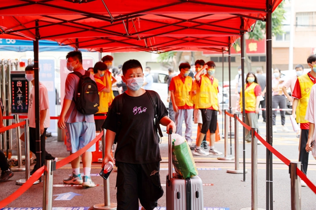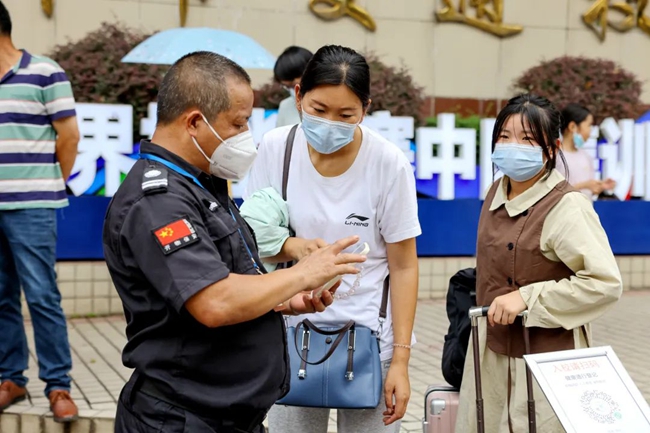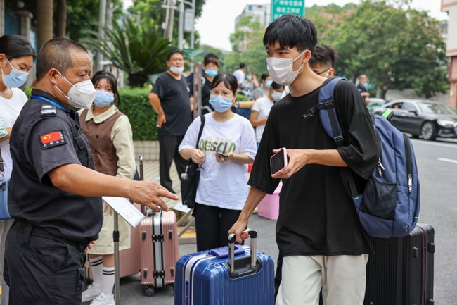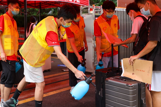 因疫情需要,接送学生的私家车需要在校门口下车,刚下车的萌新们在志愿者和安保教官的指引下,有序“出示健康码”、“测温”、“出示核酸阴性证明”、“消毒行李”后,从容欢快地踏进校门。