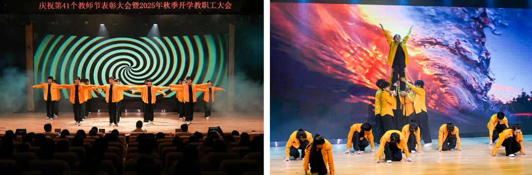 师生同台献艺,以精彩表演共庆节日。校园文化中心芳华舞团以激昂青春的舞姿和饱满热情点燃全场气氛;歌曲与乐器表演《沧海一声笑》,悠扬旋律与豪迈歌声相得益彰,既传承传统文化深厚韵味,又彰显了教职工团结奋进、昂扬豁达的精神风貌,为大会注入了别样的温情与力量。