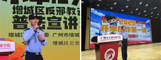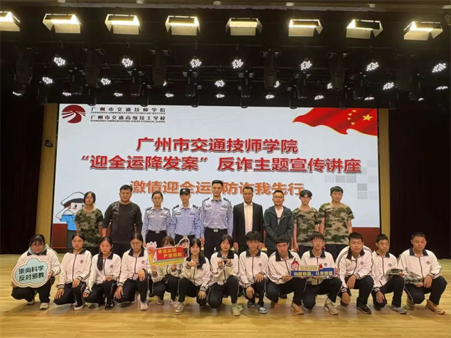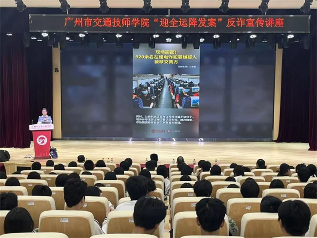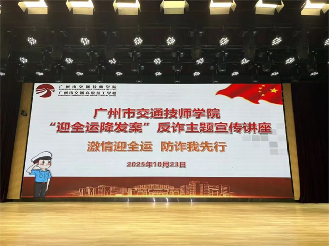 2025年10月23日下午,广州市交通技师学院在科教城校区B2报告厅举办了“迎全运降发案”反诈宣传讲座活动。学生工作处杨宇峰主任、刘胜坤老师以及各产业系近8000名学生通过线上线下方式参与了此次讲座。讲座由学生工作处许锐埼老师主持。