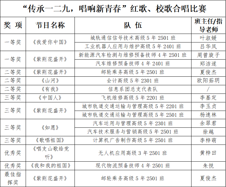 评委们从歌曲演绎、团队合作及创意等多方面进行了综合评审,最终评选出获奖团队。其中,城轨通信信号技术高级5年2501班与工业机器人应用与维护高级5年2401班合唱的《我爱你中国》,新能源汽车检测与维修预备技师4年2501班与汽车维修预备技师4年2401班合唱的《紫荆花盛开》荣获一等奖。各参赛班级班主任或指导老师为获奖队伍颁发荣誉证书和奖杯,并对他们的出色表现表示祝贺与肯定。