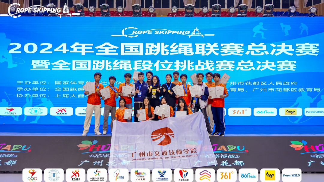 12月26日至28日,中国体育彩票2025年中国国际跳绳公开赛暨全国跳绳联赛总决赛在广州花都区东风体育馆成功举办。来自全球16个国家和地区的运动员齐聚花都,赛事总报名人数突破3000人次,规模与影响力创下新高。在人文素养系侯辰、刘奕均老师及学生处郭波老师的联合指导下,学院跳绳队16名队员奋勇拼搏、捷报频传,一举斩获5项全国冠军,并在多项赛事中跻身前八。队伍凭借出色的赛风赛纪,荣获“体育道德风尚奖”,实现了运动成绩与精神文明的双丰收。