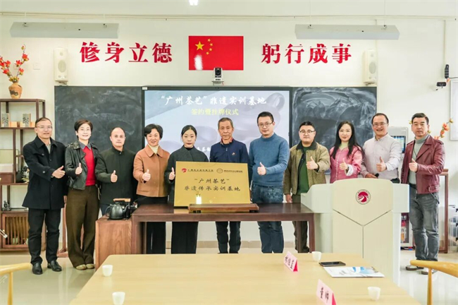 在全体嘉宾见证下,双方完成签约,并共同为“广州茶艺”非遗传承实训基地揭牌、合影。该基地的正式启用,标志着广州茶艺文化传承与发展迈入新阶段。
