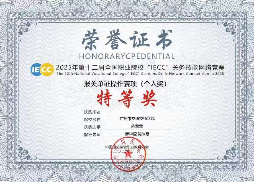 12月19日,由全国报关职业教育教学指导委员会主办的第十二届“IECC”全国职业院校关务技能网络大赛圆满落幕。本届大赛共吸引全国113所职业院校、5000余名学生参赛。广州市交通技师学院物流与商贸产业系组织国际关务、现代物流、电子商务等专业200名学生参赛,斩获特等奖2项、一等奖80项、二等奖33项、三等奖67项,姚子钰、康华滢等13位指导教师获评“优秀指导教师”,创下学院参加该项赛事以来的最佳成绩。