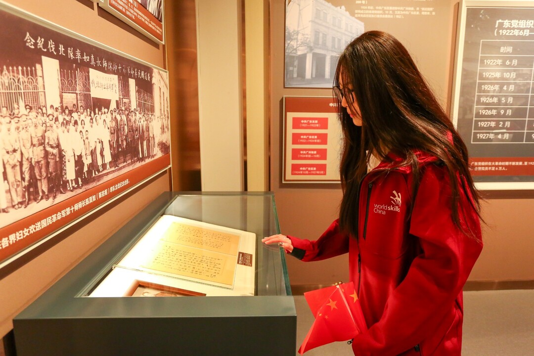 走出实训室,中共三大会址纪念馆成为集训队的“红色研学课堂”。在珍贵史料与复原场景前,革命先辈筚路蓝缕、攻坚克难的奋斗历程,不再只是书本上的单薄文字,而是转化为直击内心的精神力量——这份不畏艰难、坚守信念的红色精神,与冲击世界技能之巅所需的执着、坚韧、敢闯敢拼的品质同频共振。