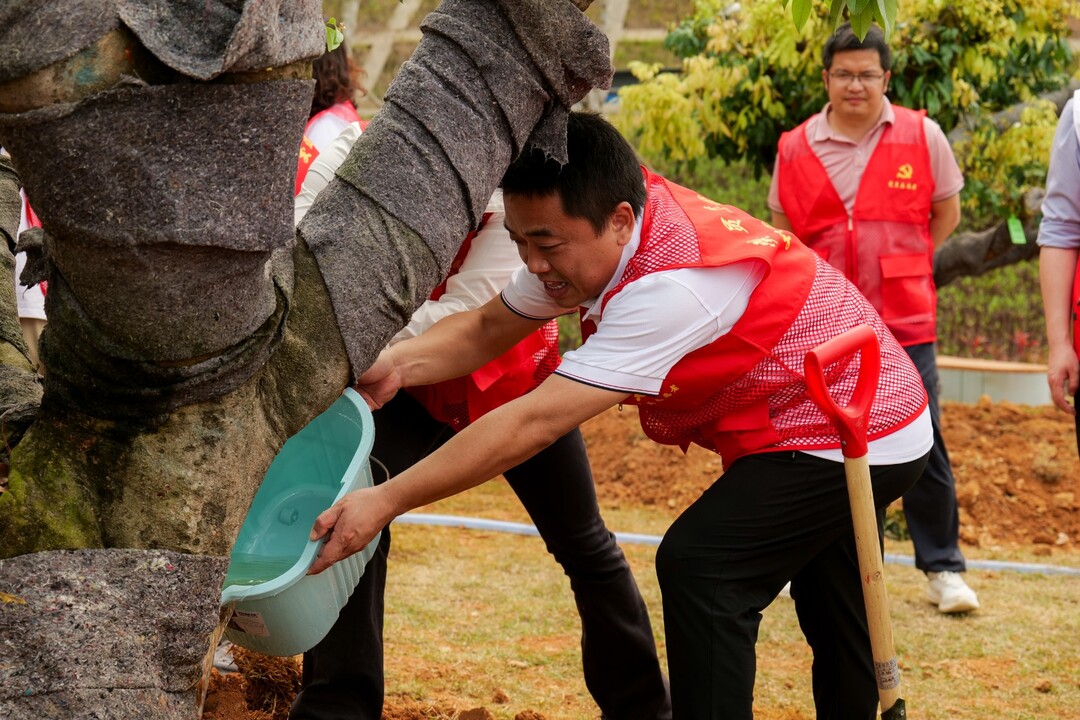 铁锹翻土、扶苗填坑、提水浇灌……植树现场热火朝天。师生代表携手种下象征坚韧品格的荔枝树,寓意“十年树木,百年树人”;工会会员代表则投身于往年捐赠树木的养护工作,拿起工具为“老朋友”除草、松土、浇水,为绿意延续贡献力量;炮仗花苗在师生协作下扎根土壤,火红的花簇预示着学院事业蒸蒸日上。一锹土、一瓢水,饱含对绿色未来的期许,更彰显了交通人扎根教育、深耕行业的初心。