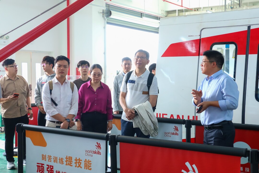 学院院长梁登、副院长刘海波热情接待来宾,并带领参观校园,深入了解学院在轨道交通职业教育领域的办学特色和专业建设成果。随后,他们前往轨道车辆技术实训基地,看望了正在开展训练交流的第48届世界技能大赛轨道车辆技术项目香港代表队教练刘子均、正选选手邓光大、备选选手陈鸿进。王经理及团队亲切询问了选手们的训练进展与生活情况,并给予悉心指导与鼓励。