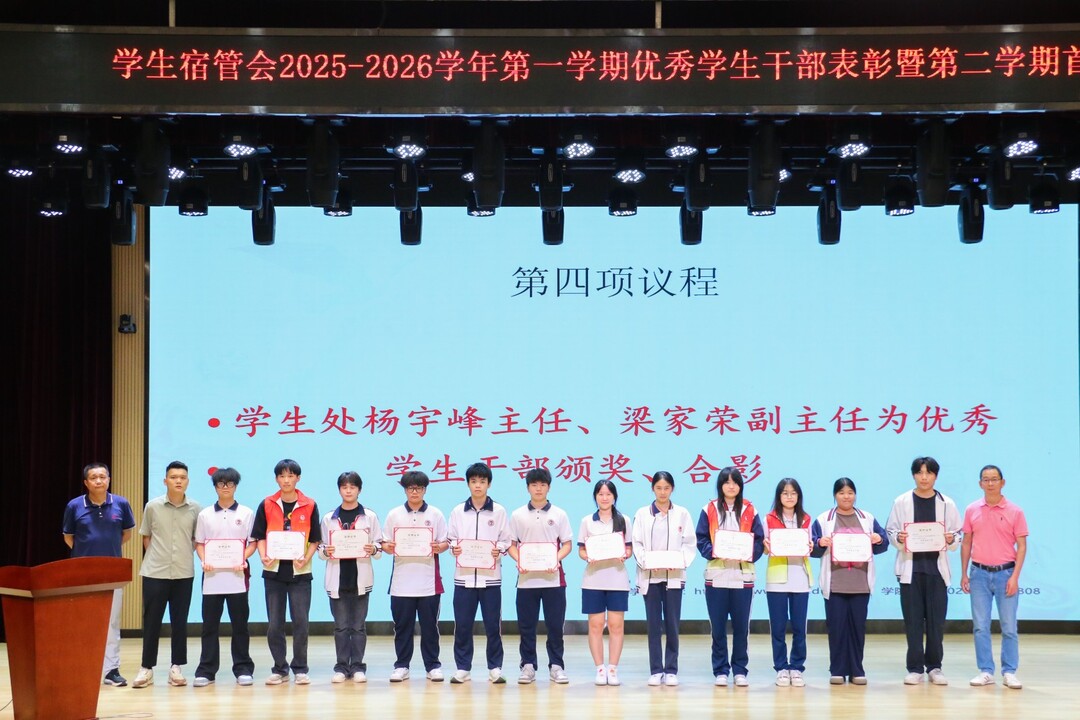 随后,宿管部教师钟鸣宣读优秀学生干部表彰决定。在庄重而热烈的氛围中,颁奖仪式有序进行。杨宇峰主任、梁家荣副主任依次为优秀学生干部颁发荣誉证书。受表彰的同学们列队整齐、精神饱满,展现了宿管会学生干部昂扬向上的的精神风貌。仪式最后,大家合影留念,用镜头定格了这份荣誉与成长的瞬间。