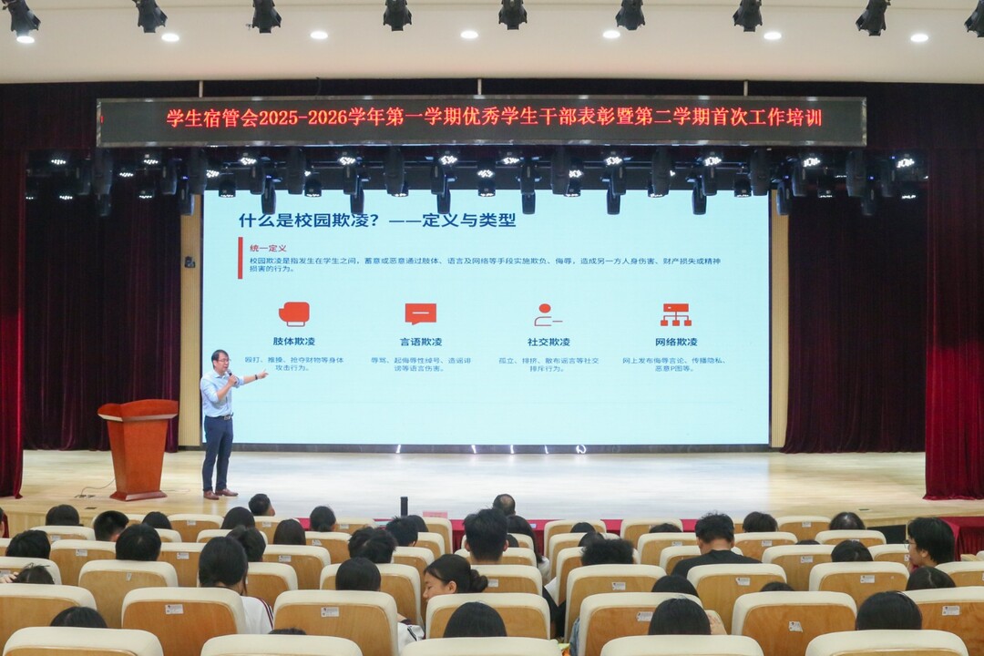 为表彰先进、树立典型,进一步提升学生宿管会干部综合素养与工作能力,4月9日下午,学院学生工作处(安全保卫处)宿管部学生宿管会在B2报告厅顺利举行2025—2026学年第一学期优秀学生干部表彰暨第二学期首次工作培训。学生工作处(安全保卫处)主任杨宇峰、副主任梁家荣,宿管部教师钟鸣、各宿舍楼楼长和全体宿管会学生干部参加活动,活动由宿管部主管姬光耀主持。