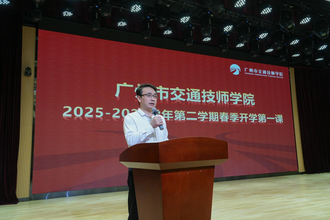 春启新程,法治护航。2025-2026学年第二学期伊始,广州市交通技师学院以“技能照亮前程,劳模工匠领航”为核心主题,开展春季开学第一课系列教育活动,将法治教育、安全防护与技能育人深度融合,引导学子增强法治意识、明确成长方向,筑牢校园安全防线。 3月2日,开学第一课系列活动正式启动,全体师生齐聚参与。