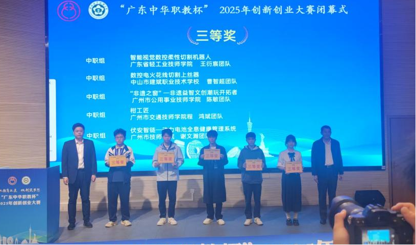 11月22日,由中共广东省委统战部、省教育厅、省人社厅指导,广东中华职业教育社主办的“广东中华职教杯”2025年创新创业大赛现场总决赛在广州圆满收官。广州市交通技师学院师生凭借精准对接产业需求的高质量创新创业孵化项目,在决赛中表现出色,从全省70所院校的143个参赛项目中脱颖而出,斩获中职组一等奖1项、三等奖1项,并获优秀指导教师团队奖,充分展现了学院以赛促教、以赛促创的丰硕成果!